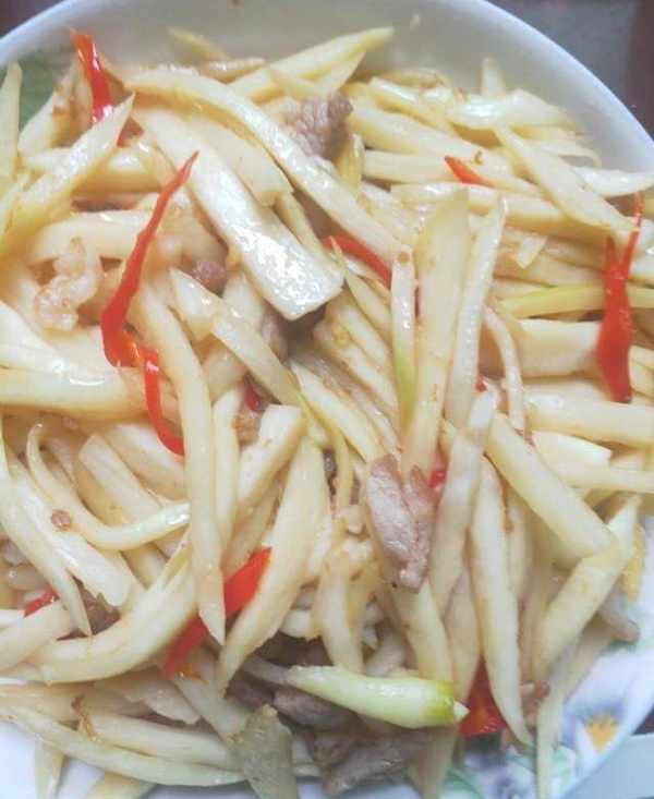 食材:高笋三根,新鲜瘦肉适量,辣椒两个,蒜末少许,姜末少许,生抽半勺,盐半勺。