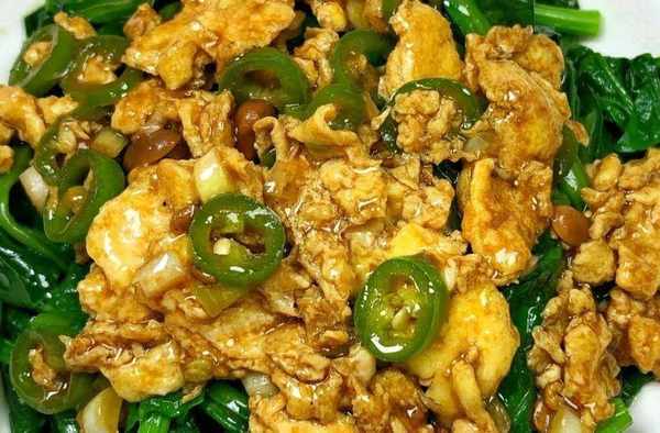 4.然后加入葱花和线辣椒炒出香味,接着倒入水淀粉,继续翻炒均匀,再倒在菠菜上,即可开吃。