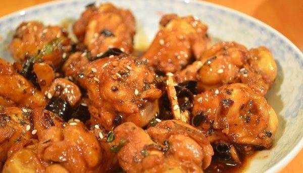 台式三杯鸡:鸡切成块,清水洗净,开水焯一遍,炒锅放植物油和香油烧热,把姜片煎到微焦,放蒜瓣、葱段炒香,然后入鸡块翻炒,依次加入台湾米酒一杯、混合生抽和老抽半杯(其中生抽多半)、1/4杯糖(冰糖最好),翻炒,收汁,熄火,入少许香油,撒九层塔,盖盖焖半分钟后,盛盘。