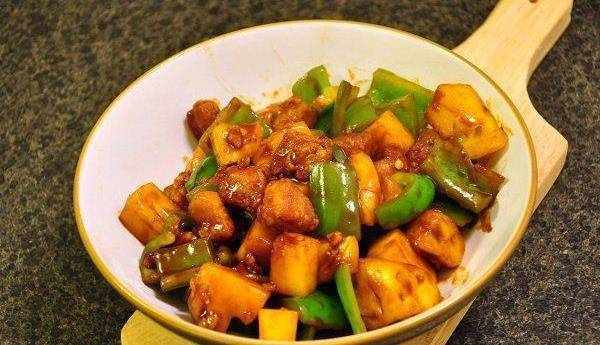 菠萝咕咾肉:里脊肉切成大丁,撒上盐、白胡椒粉、料酒,打入一个鸡蛋搅拌匀,把挂满蛋液的里脊肉放入到淀粉中裹满淀粉,用最小一点的锅倒入玉米油,约7成热的时候放入裹满淀粉的里脊肉,炸制金黄,取出沥干备用番茄沙司+少许盐,生抽,少许白糖调匀备用,菠萝罐头取几块,切成小块备用。尖椒切成菱形片,锅中倒入番茄沙司汁,可以微微加热,加入炸好的里脊丁,菠萝块,青椒片,迅速翻炒,裹满锅中的番茄沙司汁后即可出锅。