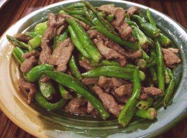 尖椒牛柳:牛柳加入水淀粉,生抽后腌制半小时,尖椒入油锅爆炒至虎皮状,沥油捞起,接着直接将牛柳入油锅,炒至肉色变成咖啡色后,加入老抽,米酒,耗油翻炒一下,将尖椒放入一起翻炒一下,使其入味即可出锅。