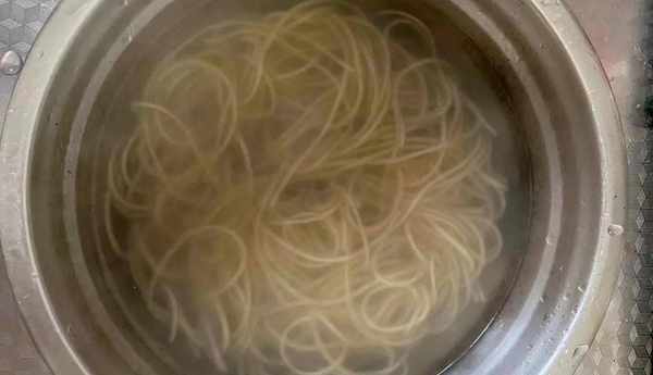 2、锅里烧开水水开了,把海带丝焯水并控水备用