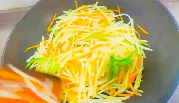 2、锅里油热,放几粒花椒炒出香味,把花椒捞出不要,然后下入蒜末爆香,倒入切好的土豆丝,红萝卜丝,青椒丝大火爆炒均匀,放盐少许,清水几滴白醋继续大火爆炒60秒,最后从锅边再滴入几滴白醋和鸡精,翻炒均匀即可出锅