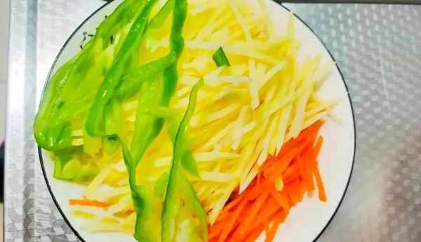 1、把土豆切丝,放水里捞出淀粉控干水分,红萝卜,青椒分别切丝一桶备用,