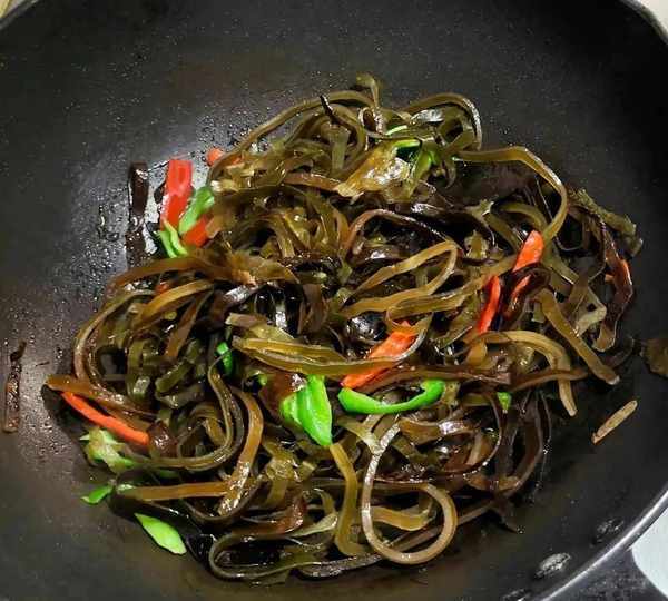 1、把海带丝提前泡发清洗干净,切成长段备用,青红椒切丝,