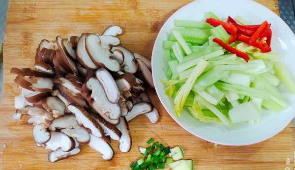 1、把香菇洗净切片,西芹去除老筋切成段,红椒也切成段,