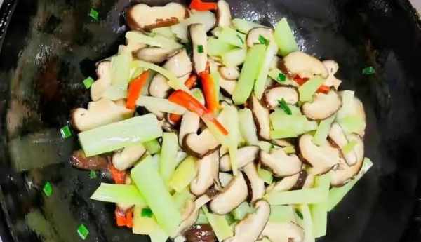 食材:西芹,香菇,红椒,花生油,盐,鸡粉,白糖,蒜片