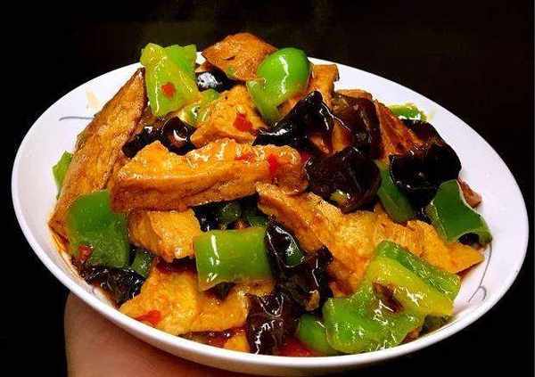 制作过程:1、准备材料:豆腐切成三角形片状,木耳提前泡发撕成小块,尖椒也切成三角块,葱姜蒜切末备用;