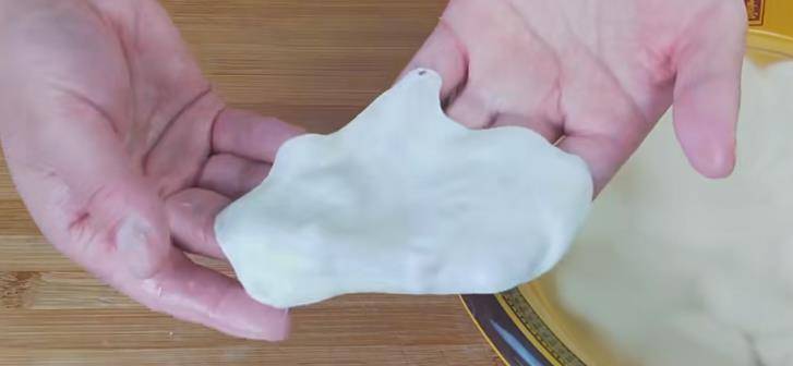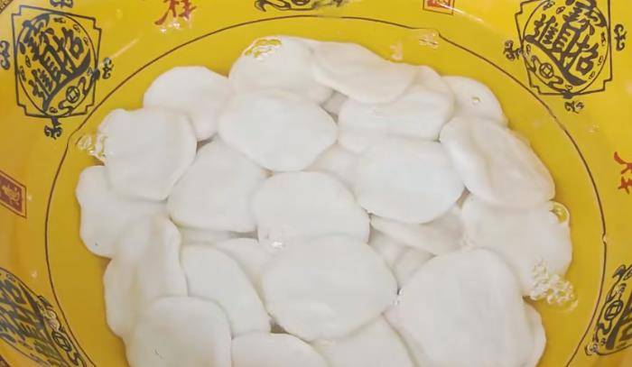 2、 取出醒好的面团,揉成长条状,用刀切成大小均匀的小块,再用手压成面饼。将面饼放入大碗中,加入清水没过面饼,浸泡20分钟,这样做出来的面片会更加滑嫩。
