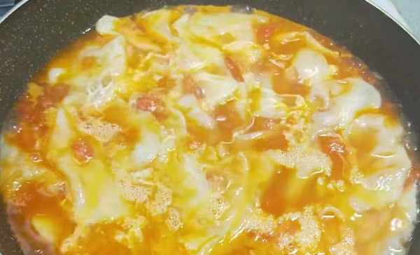 4、 取出浸泡好的面饼,用手轻轻拉扯成薄片,下入锅中,稍等3分钟煮定型后,用勺子轻轻搅动避免沾锅,继续下入面片,直至份量合适后,再打入两颗鸡蛋液,加入几片上海青菜叶,放适量的食盐,白胡椒、蚝油调味,搅拌均匀煮沸后就做好了。