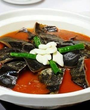 3.将出锅后的水鱼加入调料煨烂,再过滤掉汤汁中的颗粒;