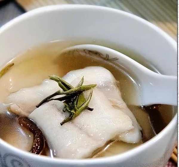 3、把原汤进行调味,先滴入几滴绍酒。撒少许味精和盐。把调好味的原汤烧开,然后倒入盛鱼片的容器里。趁热撒上适量银针茶。最后撒少许胡椒粉便可上桌食用。