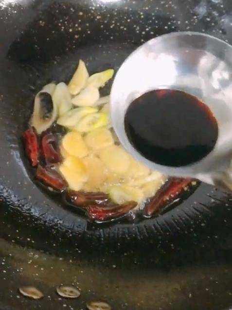 3、起锅烧油、葱、姜、蒜、红辣椒、酱油、适量加水