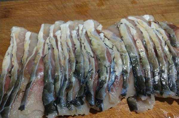 1.草鱼取鱼肉,尽量是没有刺的那个部分,切成厚度约5mm的片。