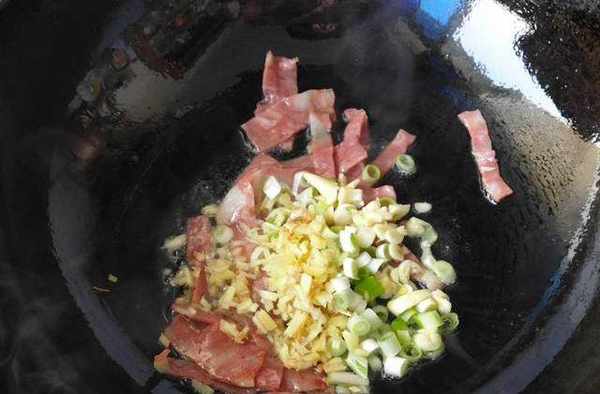 10.少许底油放入培根。煸炒到培根出油。