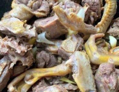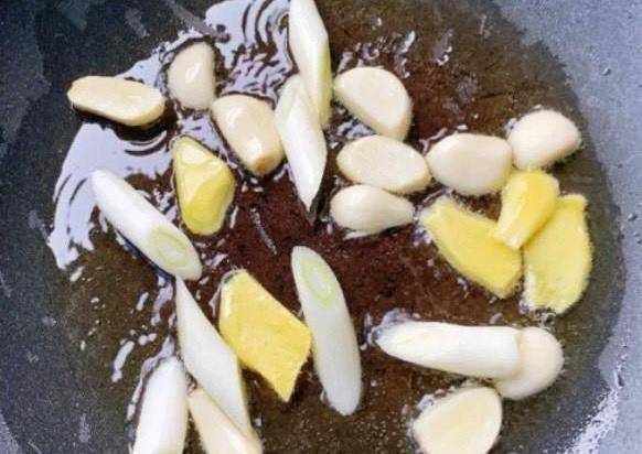 第五步:起锅烧油,油热放入葱姜蒜爆香,然后倒入沥干水分的鸭子,爆炒然后加入一个桂皮,两片香叶,两个八角,翻炒均匀