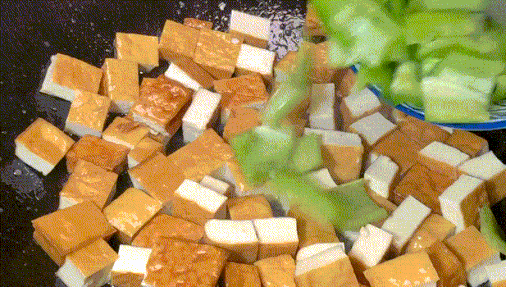 1.豆腐干洗净切丁,青椒切丁备用。