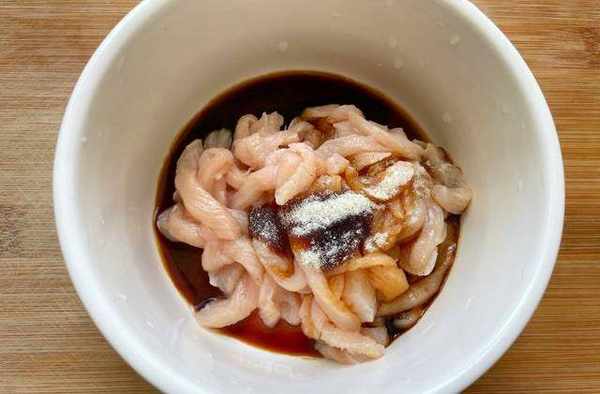 2,把鸡胸肉表面的脂肪和多余的筋膜去掉,洗净后再切成窄条,这里不要切成细丝,等下煸炒的时候很容易炒断,把切成条的鸡胸肉放入碗中,依次加入1勺料酒、1勺一品鲜酱油、1勺蚝油、适量的胡椒粉抓拌均匀,如上图所示。