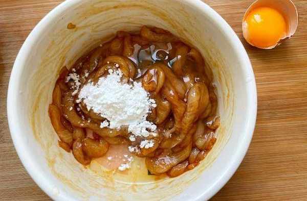 3,再加入一个蛋清,少许玉米淀粉抓拌均匀,放置一旁腌制一会儿,室内温度高的时候要放入冰箱冷藏腌制,如上图所示。