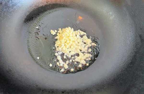 7,接着锅中留有少许底油,在油温不是很高的时候放入蒜末,小火煸炒出香味,如上图所示。