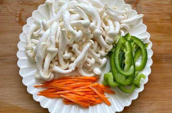 4,趁着鸡胸肉腌制的时间,我们来处理其他的配菜,海鲜菇切去根部掰成一朵朵,洗净备用;胡萝卜去皮后切成丝;青椒洗净切成丝;大蒜去皮切成蒜末(忘记拍照了),如上图所示。