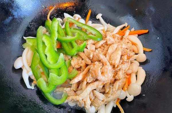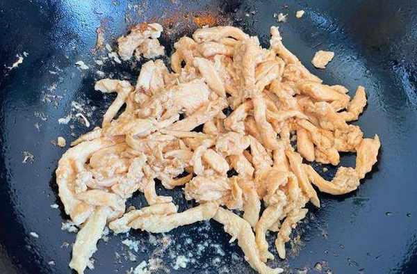 9,再放入之前炒好的鸡胸肉和青椒丝,快速翻炒均匀,如上图所示。