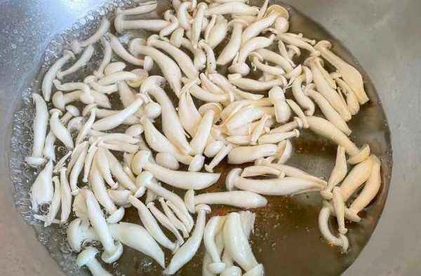 5,起锅加入适量的水,锅中水煮开后先加入一小勺食盐,再放入海鲜菇焯水40秒左右,捞出后用冷水浸泡冷却,如上图所示。
