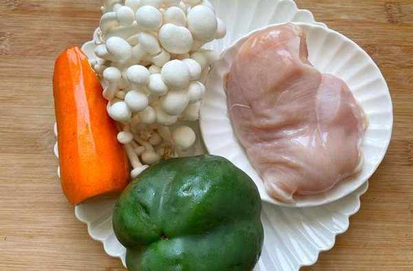 1,准备好所需要的食材,如果觉得海鲜菇比较长可以切成两段哈;鸡胸肉一小块儿就够了;能吃辣的可以把青椒换成杭椒,如上图所示。