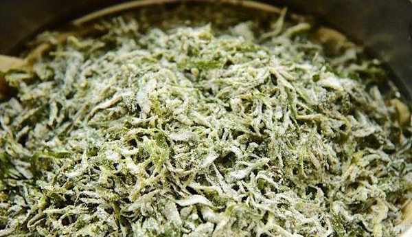 3、锅中水烧开,把拌均匀的扫帚苗倒入锅中。大火蒸熟。