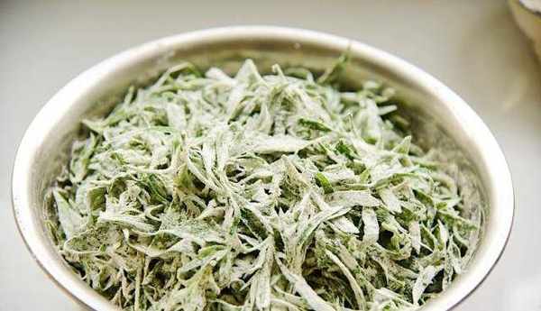 2、先把扫帚苗用淀粉拌一下,再加入面粉拌均匀。