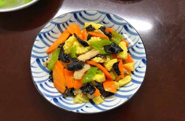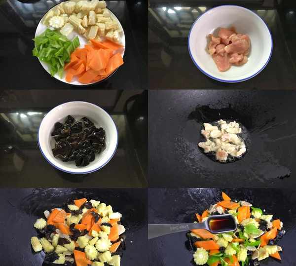 【材料】:玉米笋150克,青椒1个,胡萝卜半根,猪肉80克,黑木耳1小把,盐少许,轻盐酱油1勺,油适量