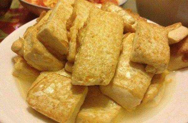 3.待油热后将五香豆腐放入煎至两面呈金黄色且豆腐表面有小气泡鼓起