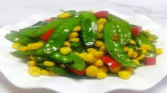 配料:扁豆、适量玉米、红椒几颗、盐、油、葱、姜、蒜。