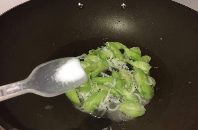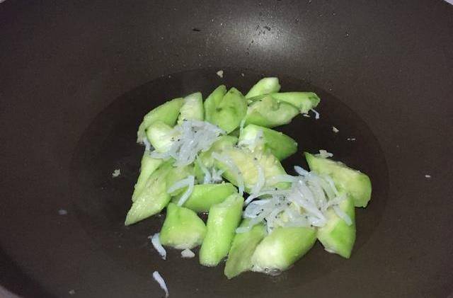 4、丝瓜炒至稍稍变色后倒入洗好的银鱼进行翻炒。