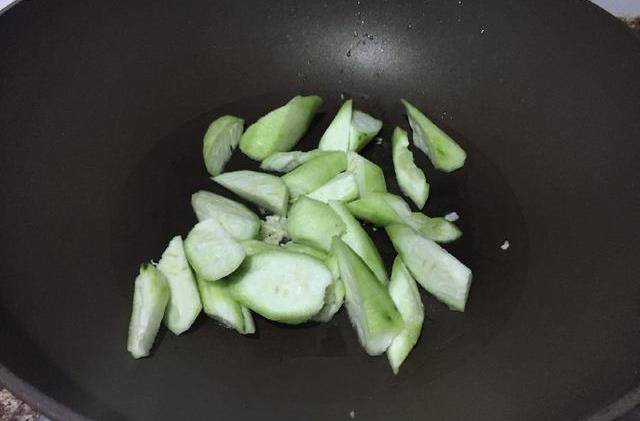 3、锅内重新热油,倒入切好的蒜爆香,再放入丝瓜翻炒均匀。