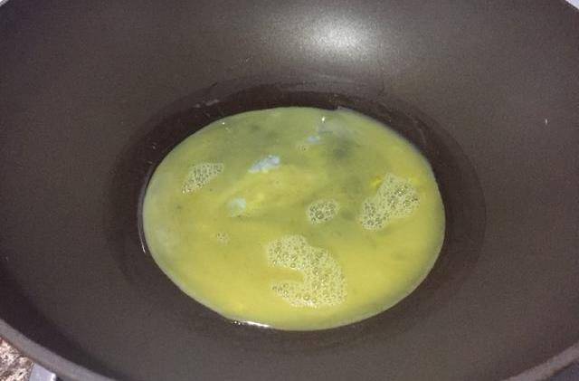 2、鸡蛋打入碗中加少许盐打散,锅内热油倒入搅拌好的鸡蛋,快凝固时划散盛出备用。