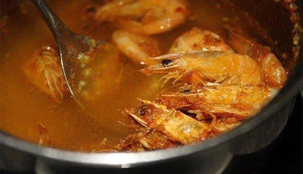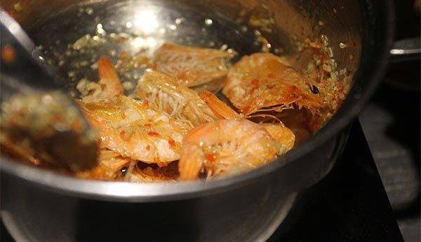 2、放带皮虾,一会儿后放茄膏,一会儿再放冬阴功酱,期间一直不断搅拌。