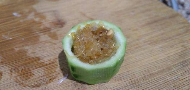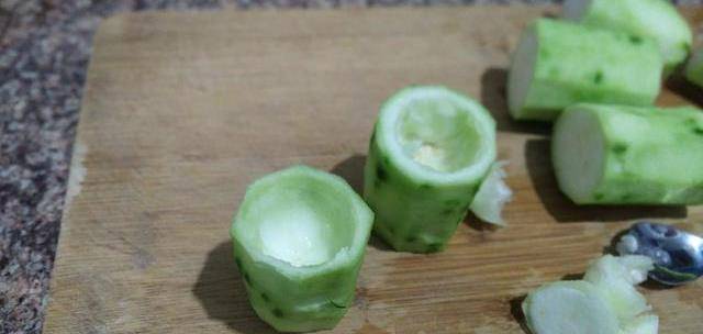 8、丝瓜去了皮切长短相同的段,再将中间挖空,底不要挖穿,底穿后料会露出来。