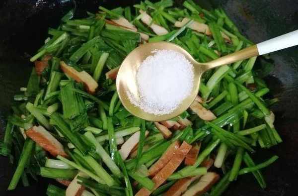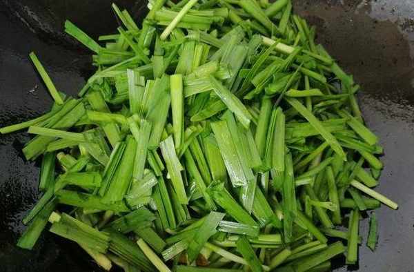 第五步:最后再放韭菜,因为韭菜好熟,煸炒几下就能出锅。