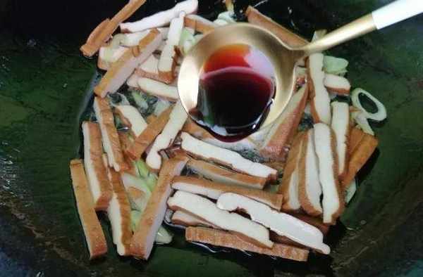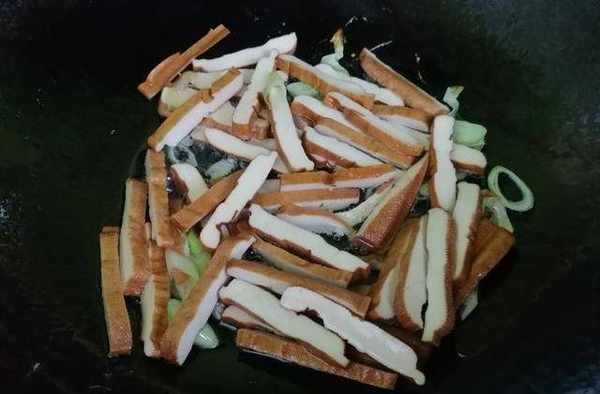 第三步:锅里倒入适量的油,放入葱花炝锅,然后先把豆腐干倒进去翻炒一下。