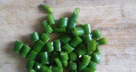 首先把辣椒切成丁,注意辣椒要选细长多籽的,这种辣味比较强烈一些,切好之后放置一旁备用。