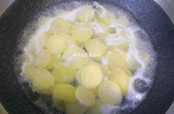 土豆洗干净去皮后切成薄片。锅中适量清水煮开,放入土豆片煮3分钟左右,捞出过凉后沥干水分备用。