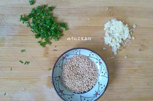 做法:小葱切花,大蒜3瓣切碎,准备一勺熟的白芝麻。