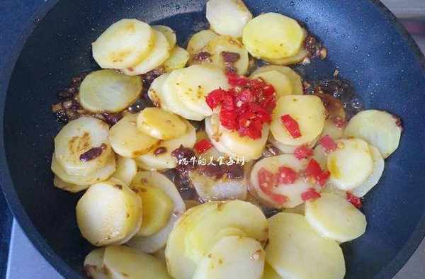 倒入沥干水分的土豆片,小火翻煎一下。加入一勺生抽,一勺剁椒,翻炒均匀。