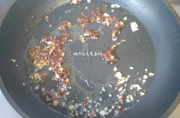 平底锅倒入少许油烧热,下蒜末爆香,然后放入一勺豆瓣酱翻炒出油。