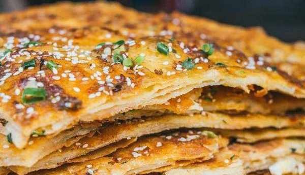 制作工艺:将所有原材料搅拌至面团光滑即可。松弛15分钟用擀杖擀成1厘米厚的薄片,抹上少许食用油,撒上少许用辣椒粉,胡椒粉、花椒粉,五香粉和盐配好的调料,稍微抹匀,再用刀切成均匀的若干等分;中间不要切断,再将每一层向中间叠起来,用最上面的一层将叠好的面层包起来收口要紧,一定要严实,松弛15分钟,再用擀杖擀成厚约1厘米圆形薄片,待烤。将电饼铛拉开,只将底火温度打至下火180度,待温度到达后,刷上少许食用油,将擀好的面饼用擀杖卷起来,放入后均匀的摊平,煎烤8分钟左右,待底部变成金黄色后,翻面再烤;直到两面都烤至金黄色即可,将烤好的饼子用竹板夹离饼铛,放在案板上,抹上事先炒好香辣酱,撒上适量切好的葱花碎和白芝麻即可。