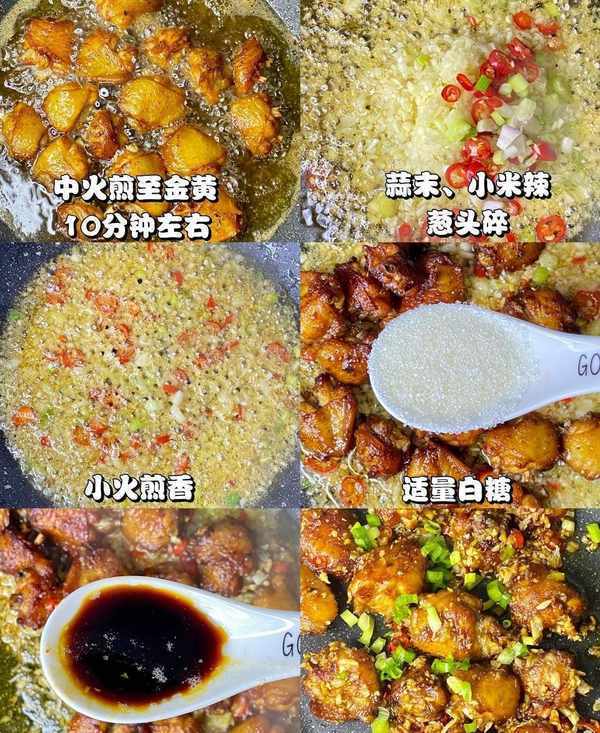3、然后锅中到了我们这边调好的料汁,在锅里煮至浓烧后倒入之前煎的土豆块,用小火炒至汤汁收汁豆腐块,也就差不多熟了,然后最后撒上一点白芝麻,翻炒均匀即可。