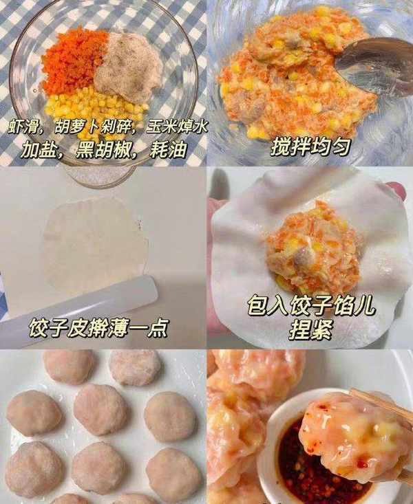 【玉米虾饺】准备食材:虾滑,胡萝卜,玉米粒,饺子皮。