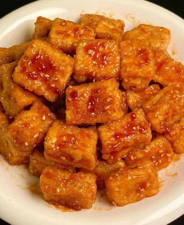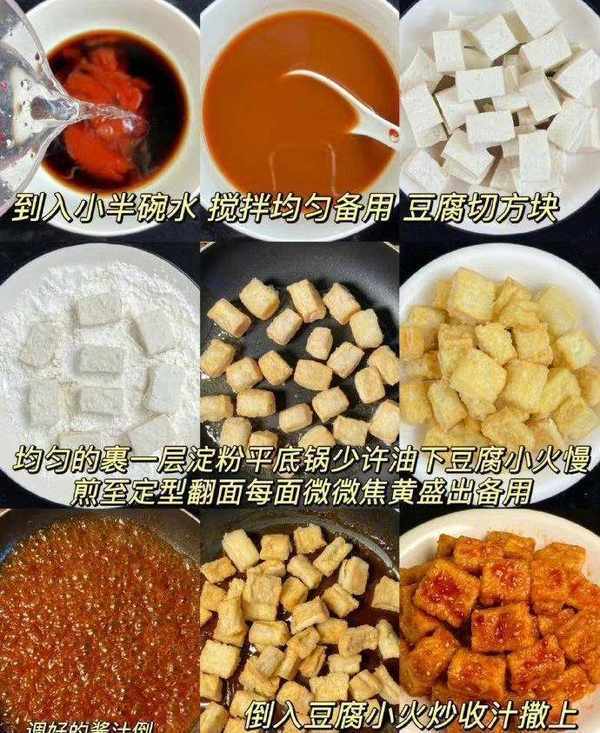 2、老豆腐切成小方块,然后将豆腐块均匀地裹上一层淀粉,在平底锅中放入少许食用油,将豆腐小火慢煎制定型,每面都煎至微微焦黄后盛出备用。