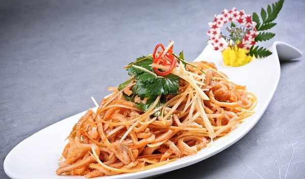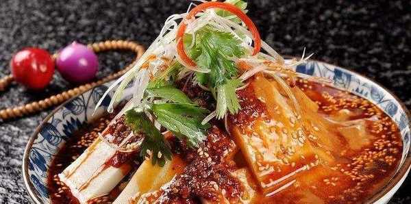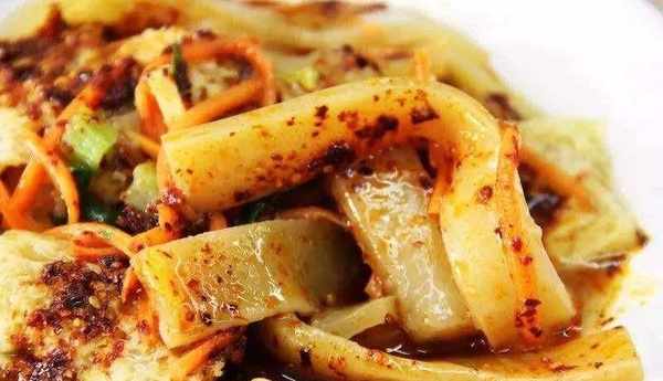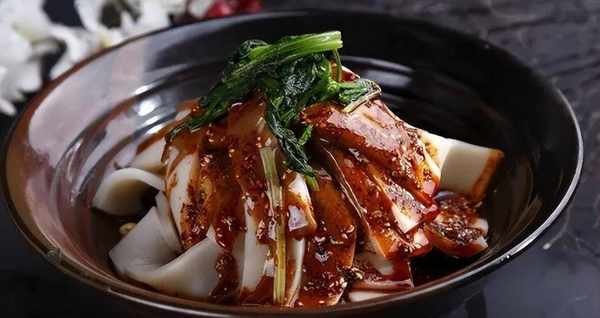 吃起来柔软又有韧劲,调味极具西北风味。颜色透明如玉,味道酸辣又凉爽。